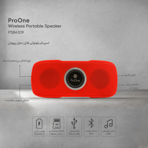 اسپیکر بلوتوثی پرووان مدل PSB4109 یکی از زیباترین اسپیکرهای ساخت این شرکت است. این محصول همانطور که در دسته اسپیکرهای بلوتوث که نسخه آن از نوع 5 است قرار میگیرد، به دستگاههای مختلف ازجمله تلفن همراه و تبلت متصل میشود. با استفاده از این محصول میتوان صدای بسیار شفاف و بیس مناسبی را دریافت کرد و به موسیقی موردعلاقه خود گوش داد. جنس بدنه این محصول از ABS ساختهشده و مقاومت خوبی در برابر ضربه از خود نشان میدهد. همچنین به دلیل مواد به کار رفته در آن، با یکی از پرطرفدارترین اسپیکرهای پرووان روبهرو هستیم. وزن این محصول هم، سبک و در حدود 390 گرم است که حس سبکی و راحتی در هنگام جابجایی بهراحتی قابل حساس است. با باتری لیتیومی به کار رفته در این محصول و همچنین ظرفیت 1200 میلیآمپری آن، با یک اسپیکر با میزان ظرفیت باتری معقول روبهرو هستیم. برد مستقیم این اسپیکر بلوتوث 10 متر است و این نشانگر آن است که تا چه اندازه میتوان صدای خوبی را هنگام اتصال آن به موبایل یا تبلت داشت. میزان قدرت صدای این اسپیکر با این ابعاد بسیار خوب بوده و با دو بلندگوی 3 وات که در آن تعبیهشده جمعاً 6 وات توان خروجی دارند که صدای باکیفیت را میتوان از طریق آن شنید. زمان موردنیاز برای شارژ کردن این محصول چیزی در حدود 4 ساعت است و با این مقدار شارژ میتوان 2 ساعت از آن استفاده کرد. برای توضیح در مورد درگاههایی که در این محصول وجود دارد، میتوان به چهار پورت آن که در پشت این اسپیکر هستند اشاره کرد و یک دکمه برای روشن و خاموش کردن آن تعبیهشده است. درگاه ورودی کارت حافظهی میکرو و همچنین درگاه ورودی USB، که از طریق آن میتوان یک کارت حافظه و یک فلش مموری را به آن وصل کرد. این دسته جز پورتهایی به شمار میروند که میتوان موسیقی موردنظر خود را از راهی به غیر از اتصال به تلفن همراه و تبلت گوش داد و با کابل AUX هم میتوان به آن متصل شد.