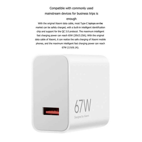 فست شارژر 67 واتی شیائومی از طراحی مینیمال و یک پورت USB بهره میبرد. پشتیبانی از ولتاژ AC و ارائه خروجی با ولتاژ و شدت جریان متنوع، سرعت شارژ بالا با توان 67 واتی، چیپ هوشمند داخلی برای تنظیم خودکار خروجی و بدنه مقاوم در برابر آتش از جمله نکات مثبت این شارژر هستند.این شارژر از فرم فاکتور مکعب مستطیلی با لبههای انحنادار برخوردار است. شیائومی در ساخت بدنه شارژر 67 واتی MDY-15-EQ از پلاستیک ABS استفاده کرده است. رنگ سفید و طراحی مینیمال نکته دیگری است که در بخش طراحی میتوان به آن پی برد.کیفیت ساخت شارژر بالا است و دو قسمت بالا و پایین بدنه به خوبی بر روی یکدیگر جفت شدهاند. شیائومی برای افزایش ایمنی شارژر در هنگام شارژ از پلاستیک با کیفیتی استفاده کرده است. این متریال از استاندارد UL94-V0 پشتیبانی میکند و بنابراین در برابر حرارت مقاومت بالایی دارد. ابعاد شارژر 58.6 در 54.2 در 28.4 میلیمتر است و وزن سبکی دارد. در قسمت بالایی شارژر یک پورت USB استاندارد وجود دارد که رنگ نارنجی آن ترکیب رنگی زیبایی را ارائه داده است.شارژر سریع شیائومی مدل MDY-15-EQ قابلیت شارژ باتری گوشیهای هوشمند با توان 67 واتی را دارد. این شارژر از پروتکلهای محافظتی مختلفی پشتیبانی میکند. جلوگیری از بالا رفتن ولتاژ و جریان، اتصال کوتاه، تخلیه الکتریسیته ساکن، پایین بودن ولتاژ و بالا رفتن دما از جمله مکانیزمهای محافظتی به کار رفته در این شارژ است.این شارژر از ولتاژ AC در محدوده 100 تا 240 ولتی و جریان 1.7 آمپری پشتیبانی میکند. علاوه بر این، به لطف چیپ هوشمندی که درون فست شارژر 67 واتی شیائومی قرار گرفته است، نیازمندی هر دستگاه به صورت خودکار شناسایی میشود و بهترین ولتاژ و جریان الکتریکی برای شارژ باتری انتخاب میشود.فست شارژ 67 واتی شیائومی MDY-15-EQ از قابلیت شارژ با خروجی 5 ولت/3 آمپر، 9 ولت/3 آمپر، 11 ولت/6.1 آمپر و حداکثر 20 ولت/3.25 آمپری برخوردار است. این شارژر همچنین از فناوری شارژ سریع QC کوالکام پشتیبانی میکند.